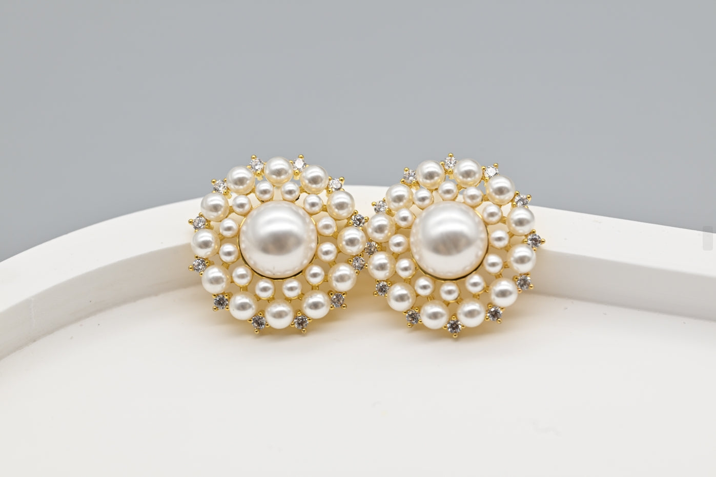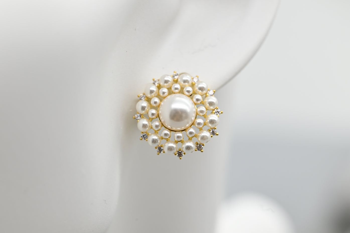 These earrings feature a luminous pearl at the center, encircled by a halo of smaller pearls and sparkling crystals for a timeless, refined elegance. Perfect for adding a touch of sophistication to any outfit, from daily wear to formal occasions.